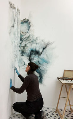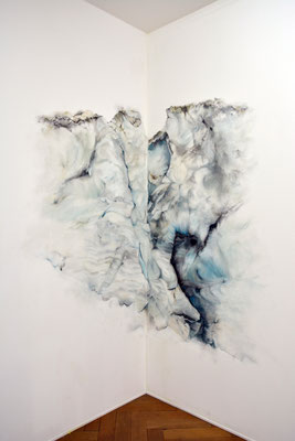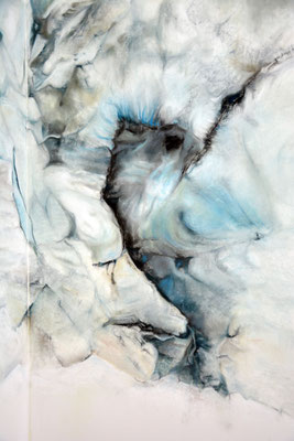 Eis – die wohl zerbrechlichste Erscheinungsform im Wandel. Das Eis ändert die Farbe mit dem Luftgehalt. Eis, das viel Luft enthält, ist weiss, solches, mit wenig Luftblässchen, schimmert blau manchmal auch grünlich. Farbkombinationen und Strukturen entstehen und vergehen im Laufe der Zeit, unter dem Einfluss von Natur und Mensch. Dieses Farbenspektrum wiederzugeben, gelingt mir am besten mit Softpastellkreide. Fragil, zart und ursprünglich – wie das Eis der Gletscher.