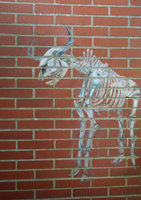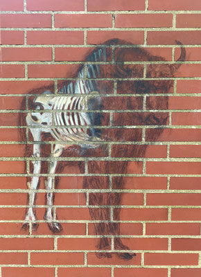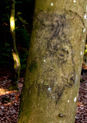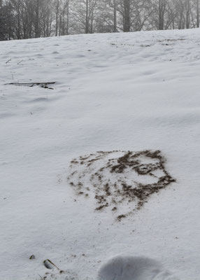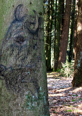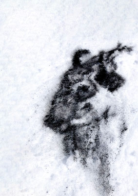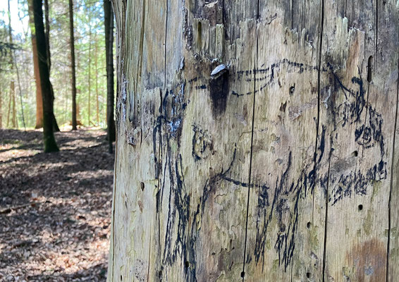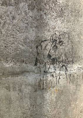 Zeichnungen mit Kreide/Asche/Kohle auf Mauer, Silo, Baum, im Schnee